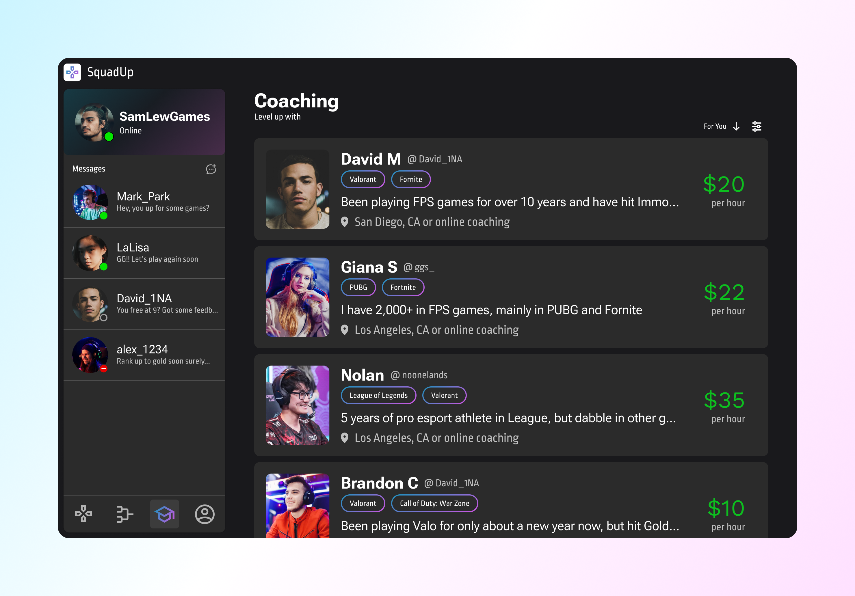 Similar to the tournaments page, this feature shows a list of the different coaches available, the different available games they coach for, and details for the service. Coaching can be local or online and would be tailored to the user's or team's skillset.