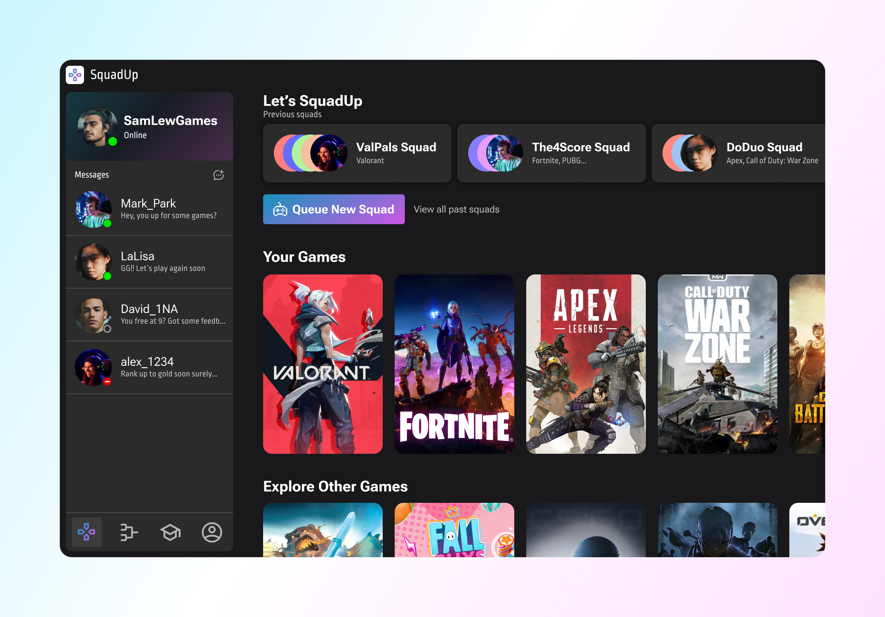 Based on our research on gamer communities, the three personas we wanted to focus on were casual, minority, and professional gamers. We wanted to reach a variety of audiences who want to play video games for fun but may also want to build and play against strong teams.