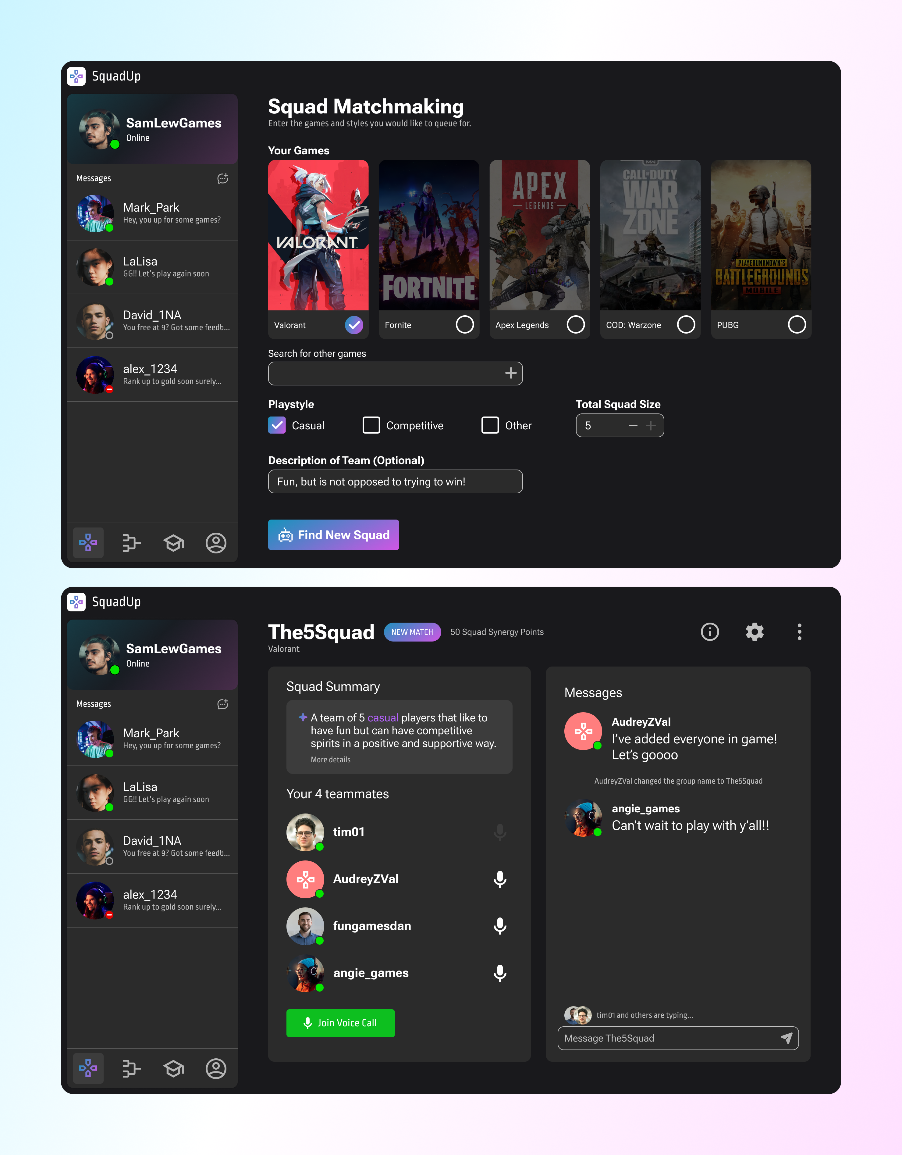Within our matchmaking feature, we wanted to keep it simple and streamlined. Based on tags and interests, the user would be able to choose what games they want to play and the playstyle they are looking for. After entering the team requirements, the user would be matched into groups that have similar interests and goals to maximize success, which would be measured by teams having positive and meaningful experiences. Once matched, users can immediately interact with their new teammates through text or voice. In cases where the atmosphere is toxic or not a match, they could also use the page controls to leave and/or report the group or any of its members.