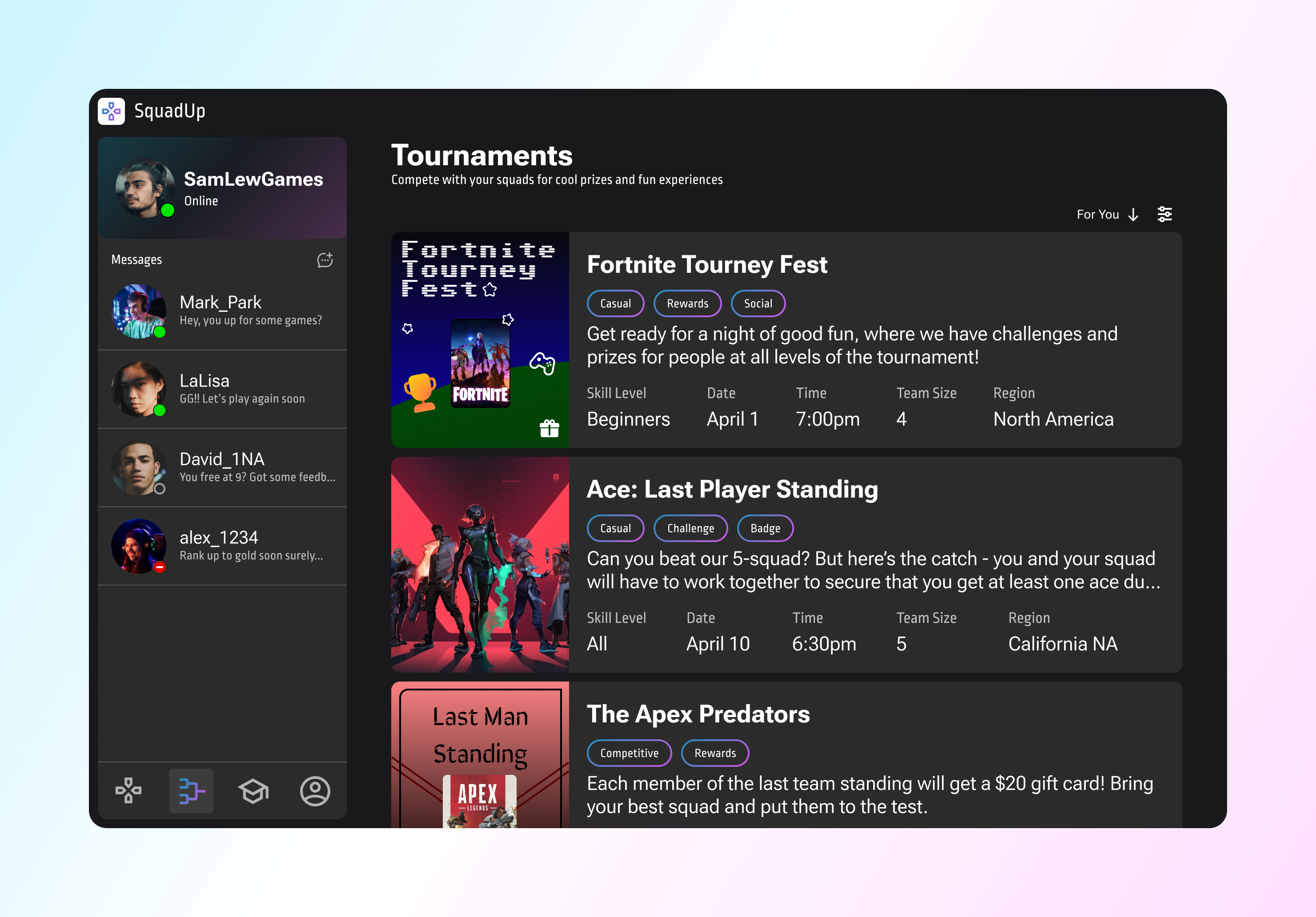The tournament page contains a list of community-hosted tournaments and competitions that your teams could participate in. By having visible fields like tags, skill levels, and team sizes, users can quickly scan the available options and select which challenge or tournament fits their teams the most. This feature aims to increase team synergy, and participation will yield Squad Synergy points.