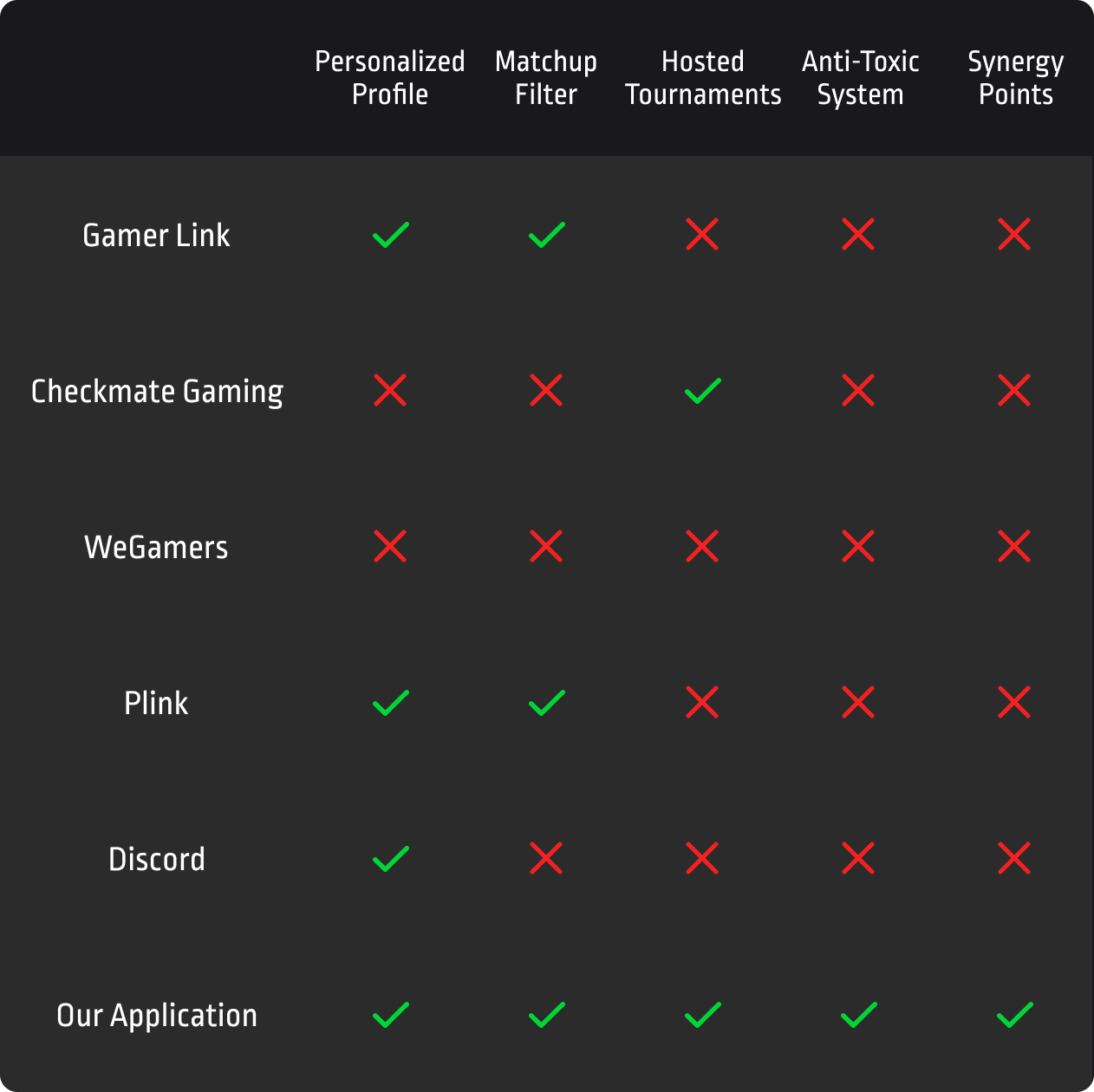 In these competitors, we saw the features that stood out, were overlooked, and possible combinations we could expand on in our application. In summary, there was no one application that combined all of the aspects needed to facilitate team matchmaking. To connect with other gamers in a positive and meaningful way, our target audience needs robust, effective, and intuitive tools to navigate the team matchmaking process. We also wanted to heavily consider the ways to preserve the longevity needed for healthy teams but also give users a way to leave and report groups that foster unhealthy dynamics. By doing so, we can provide them with a multitude of services while also fueling their gaming ambitions.