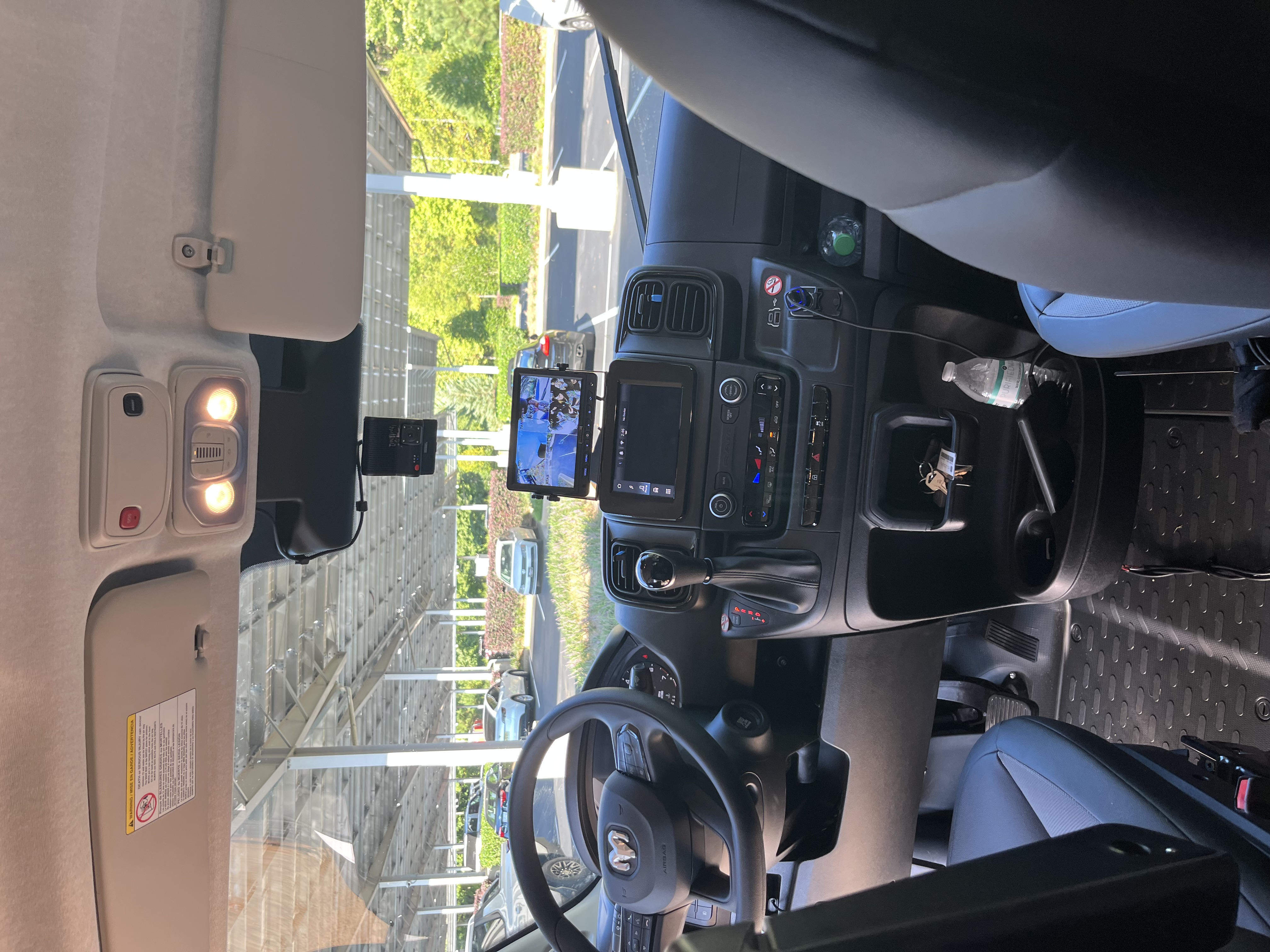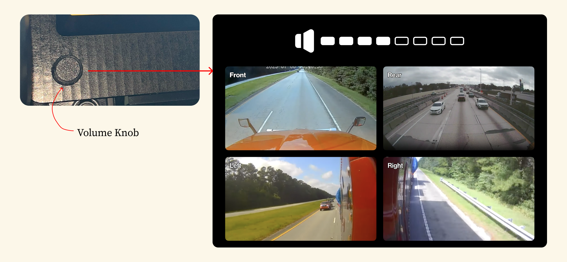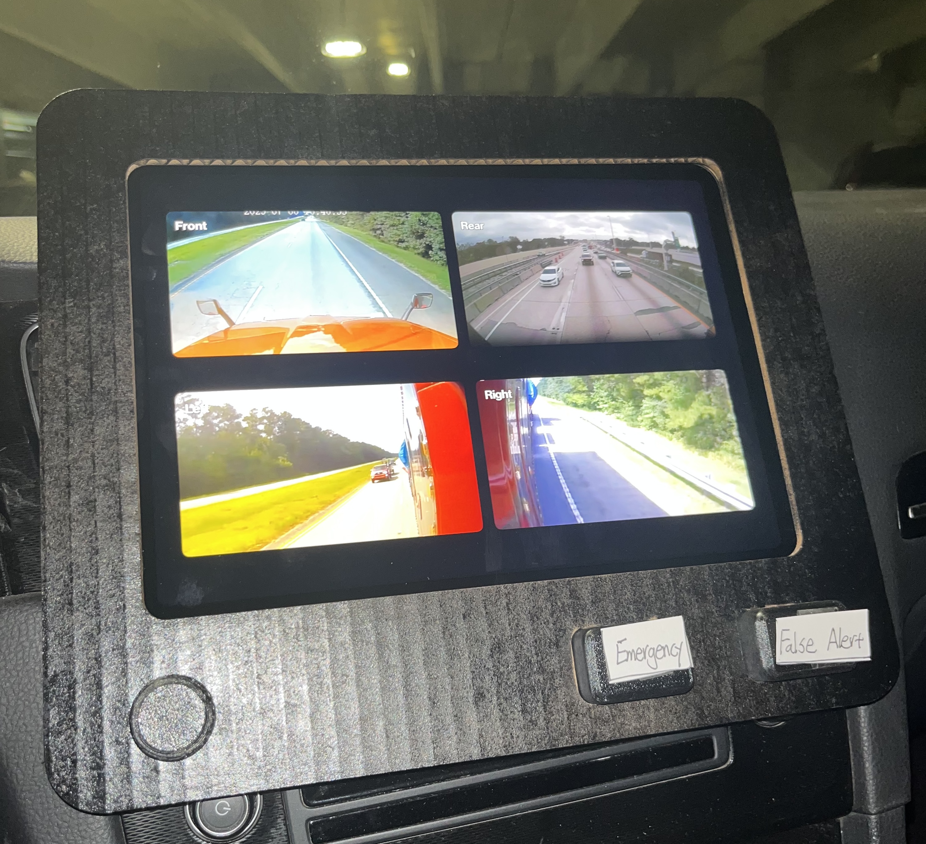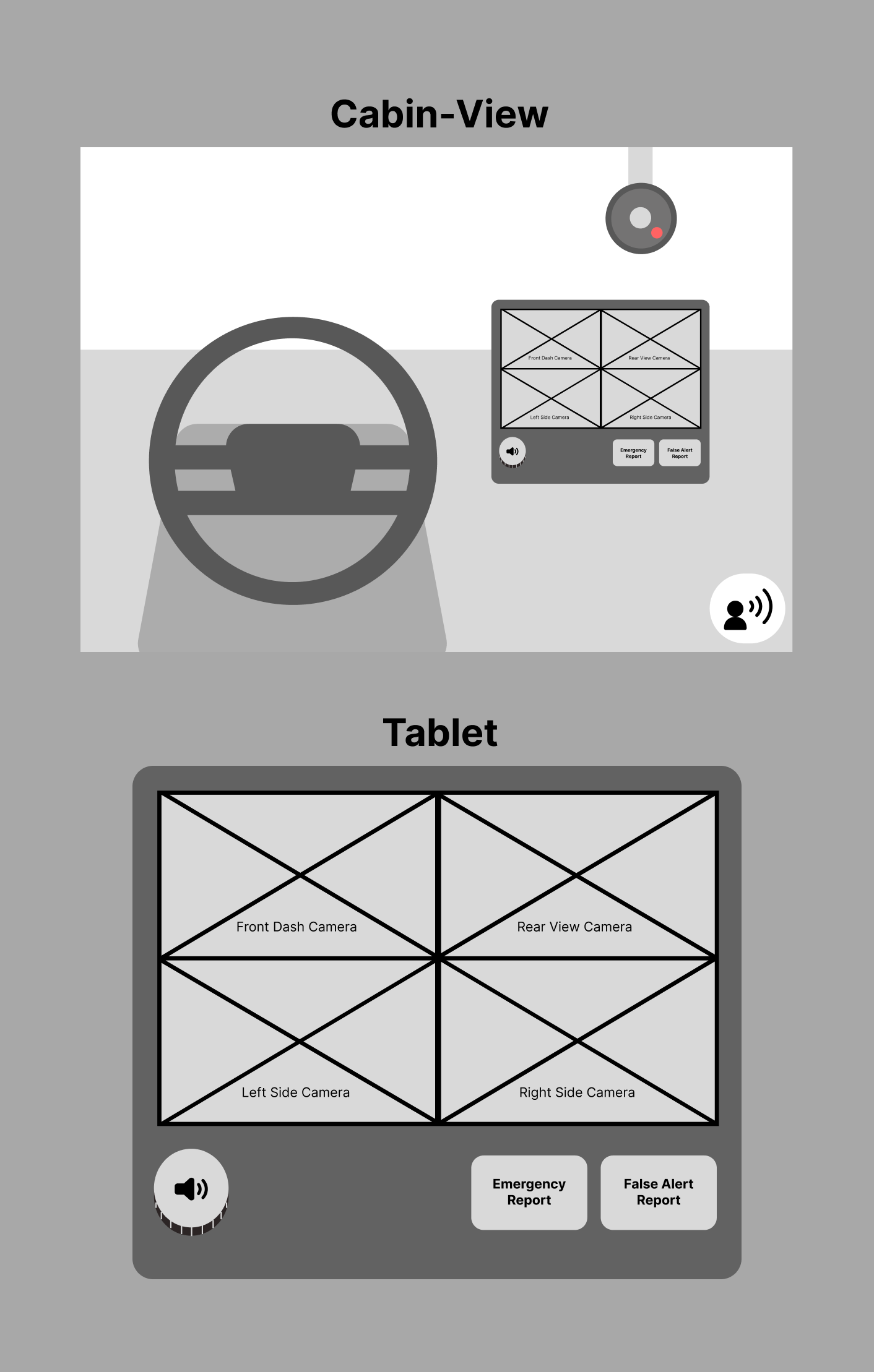 Since we involved digital prototypes, we wanted to create a view that simulates the driver being in the cabin. The cabin-view contains a steering wheel, a camera, and a tablet. The tablet has buttons and knobs at the button, for volume control, emergency reporting, and false alert reporting.
