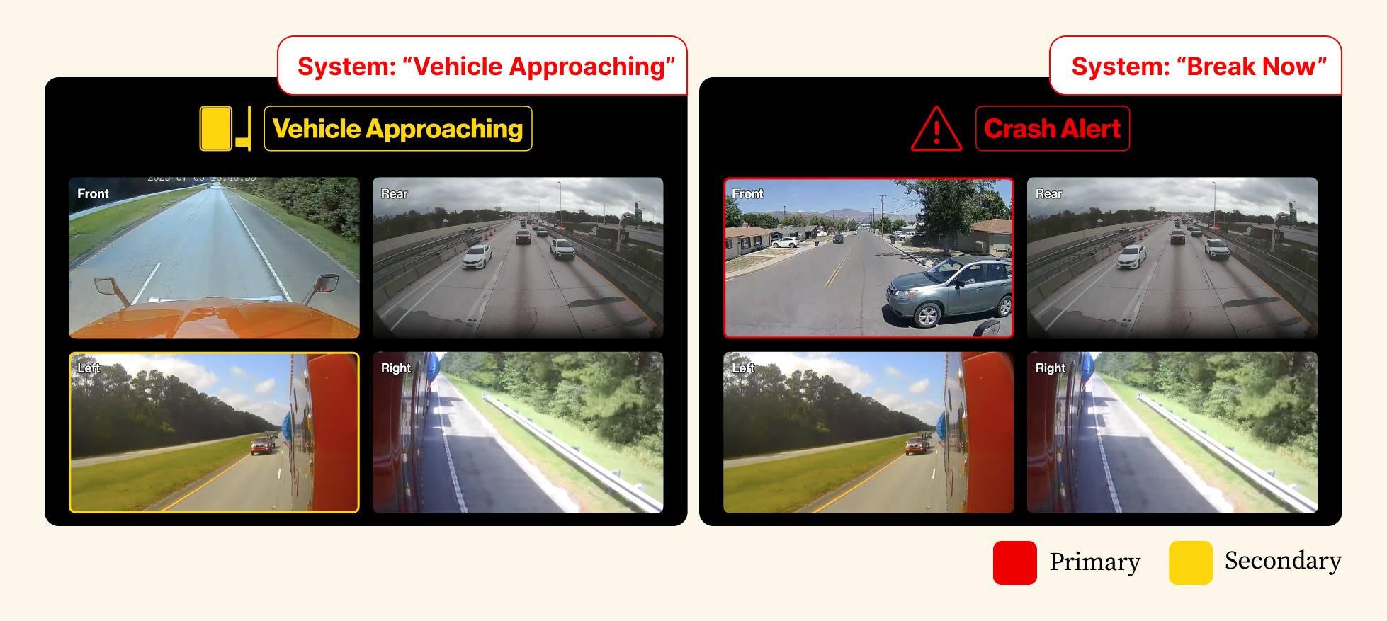 When the driver encounters a hazard from outside, like surrounding traffic or lane departures, the system alerts the user audibly and visually. The camera views affected are also highlighted based on the type of warning.