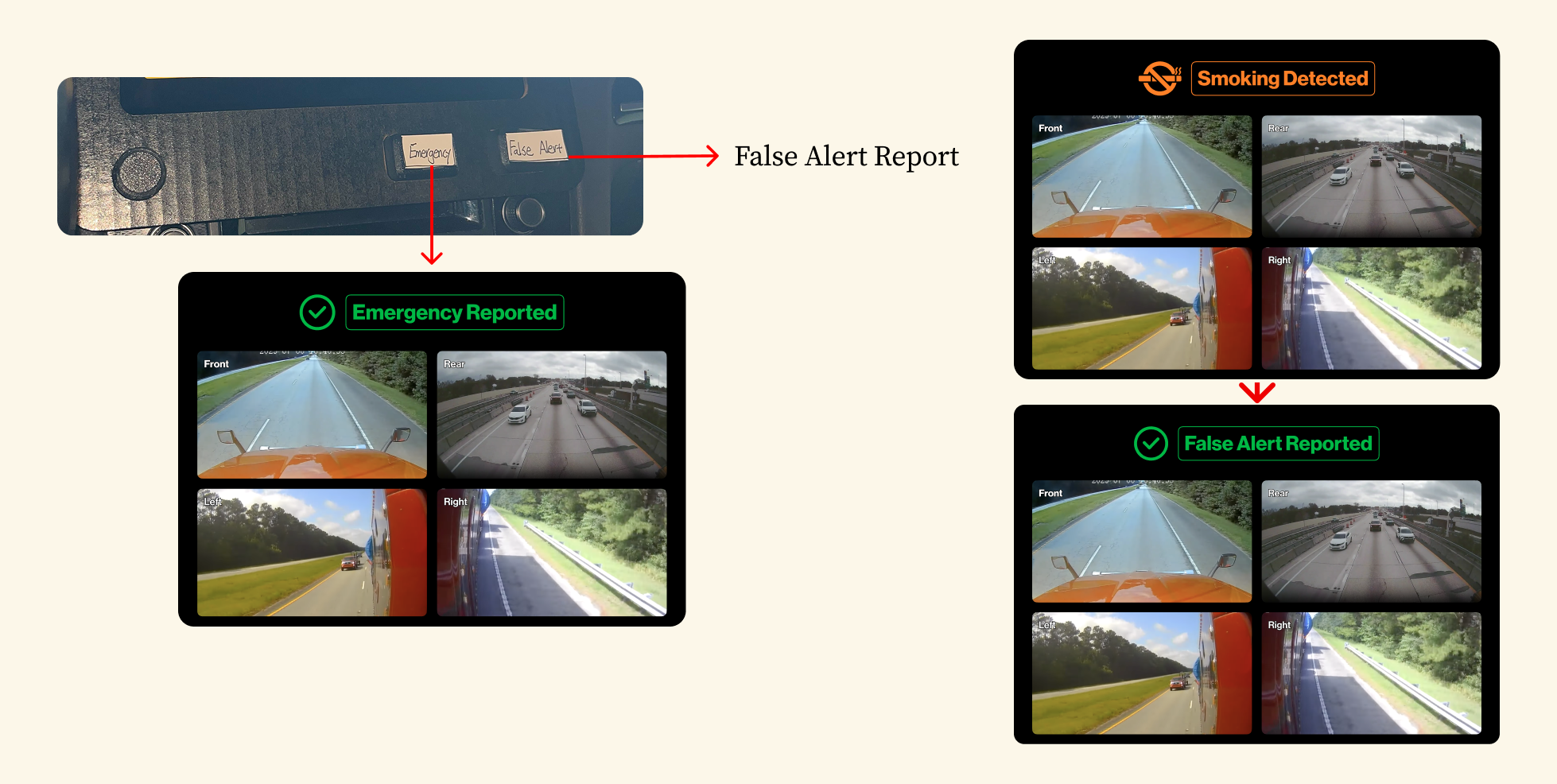When the system flags an alert based on the driver’s behaviors from within the cabin, the alert will display on the tablet screen alongside an audio alert (e.g. smoking detected). We created two versions, where one had the alerts as banners and the other displayed the alert in full-screen. Each type of alert has a unique icon next to the text description.