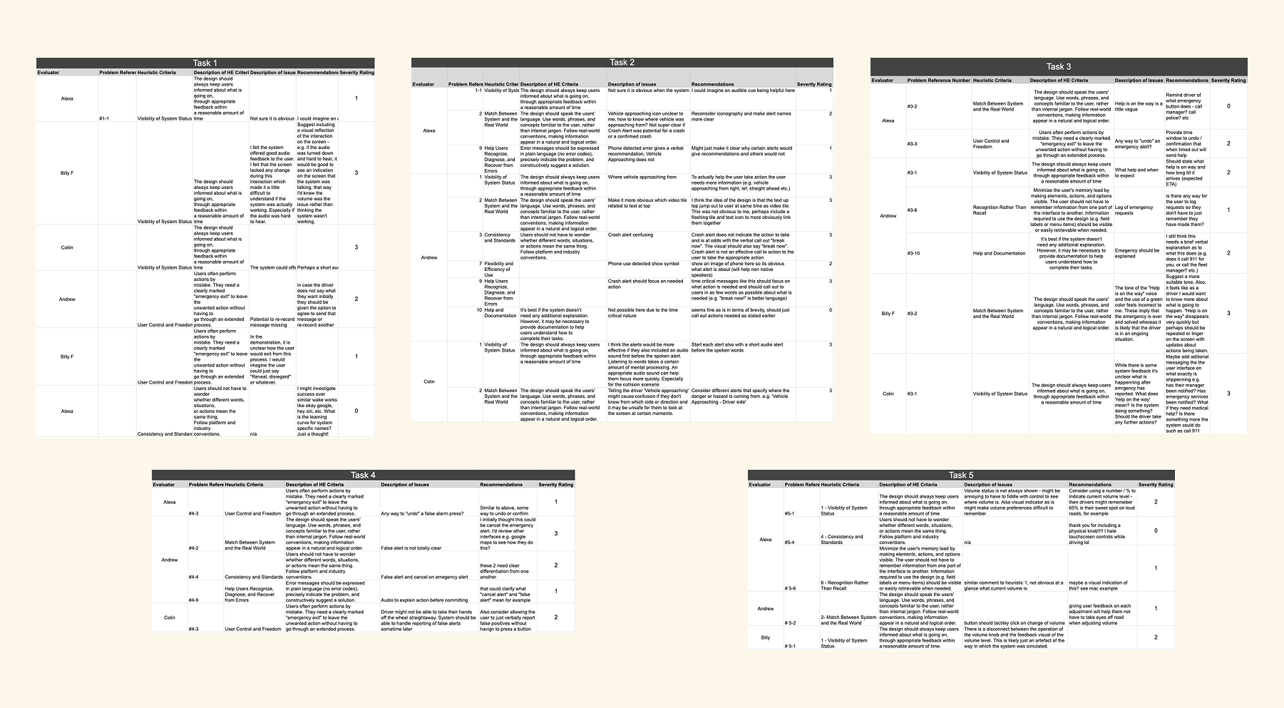 Doing evaluations on a physical prototype would normally be difficult, but we created a short video of each task for the evaluators to use. With additional set of instuctions and forms to complete, 5 evaluators from the Verizon Connect team gave input on suggestions and places of improvements regarding heuristics. They were instructed to: