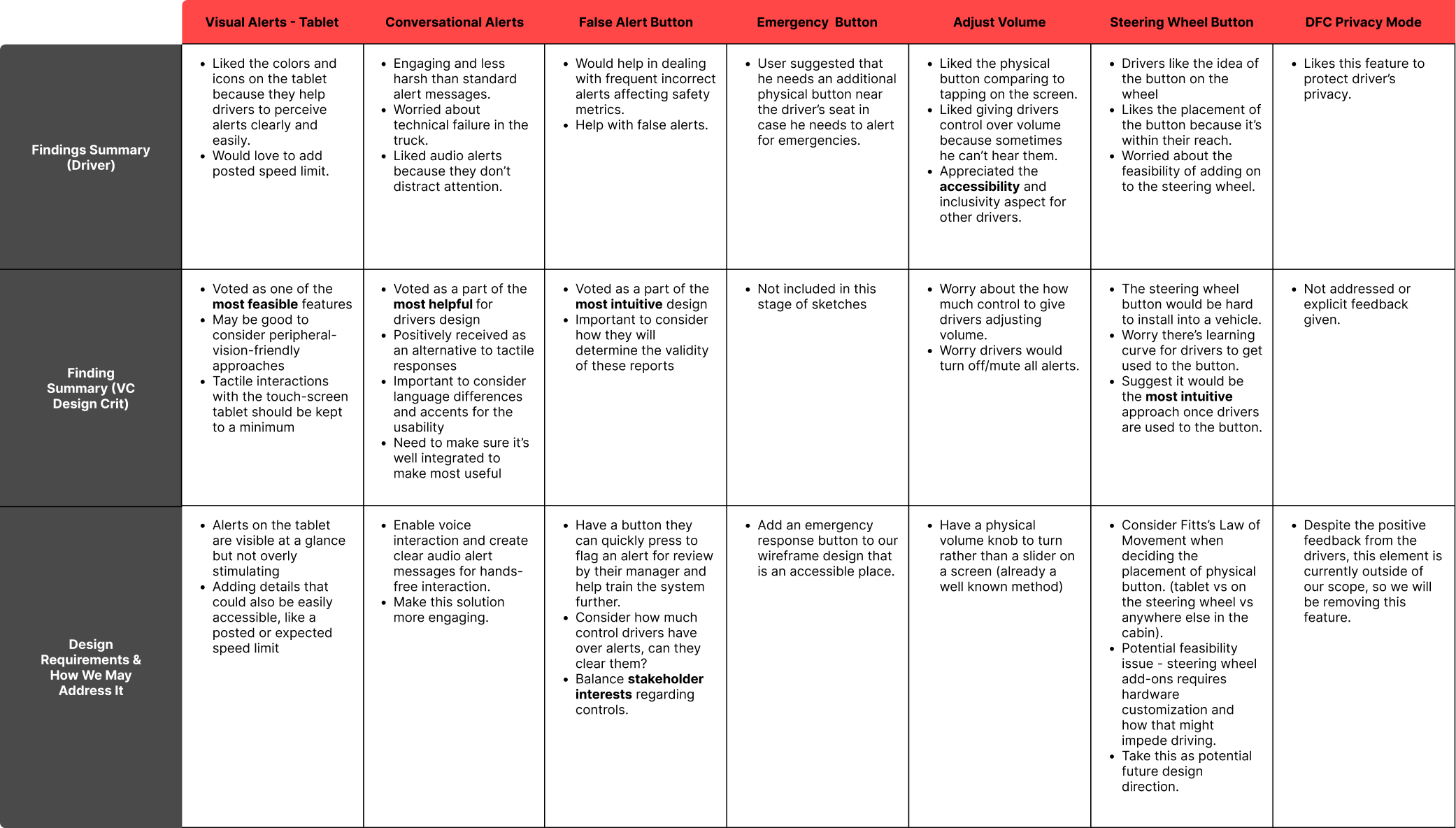 From the data across our research, we created a list of user needs. To summarize, drivers need to stay focused on driving without being distracted and have system alerts clearly, concisely, and effectively communicated to them either verbally or visually. By doing so, drivers can feel more confident and safe, knowing that they will be adequately warned about their surroundings while they are working. However, they should also feel confident that in cases that the system fails, they have a way to take some control over the problem. Like some of our interviewees stated, they should not be burdened with false alerts or audio alerts that chime so loud and often that they get headaches.