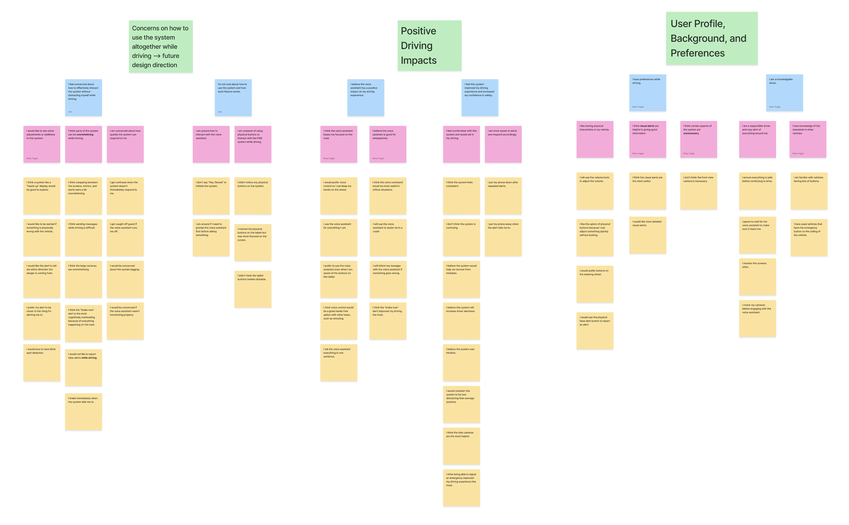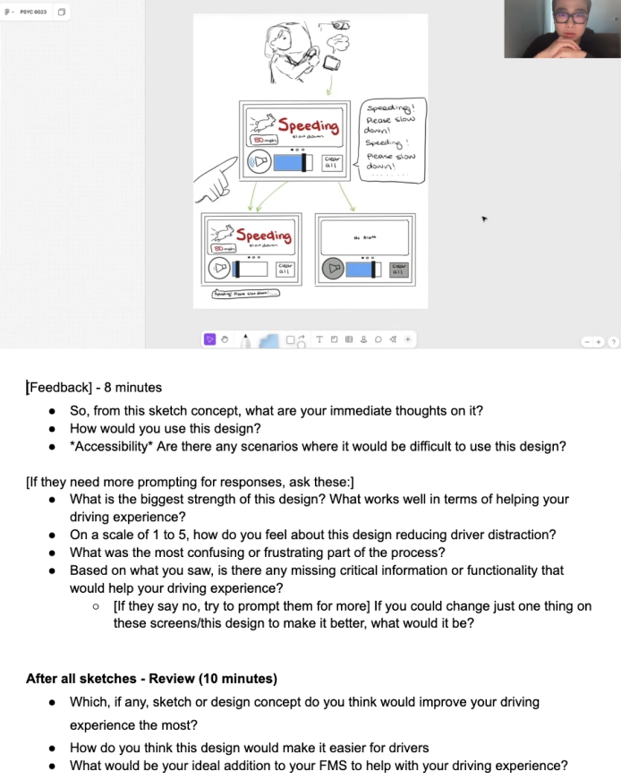 After given an explanation of each of our 4 sketches, the participant was asked for immediate thoughts and opinions on the ideas: places where the system fails or succeeds when they think about how it would apply to their in-cabin experience. Other questions like accessiblity or intuitivity in terms of visual, audio, or physical limitations while driving were also asked, especially after all sketches were explained and they were asked to compare the features against each other.