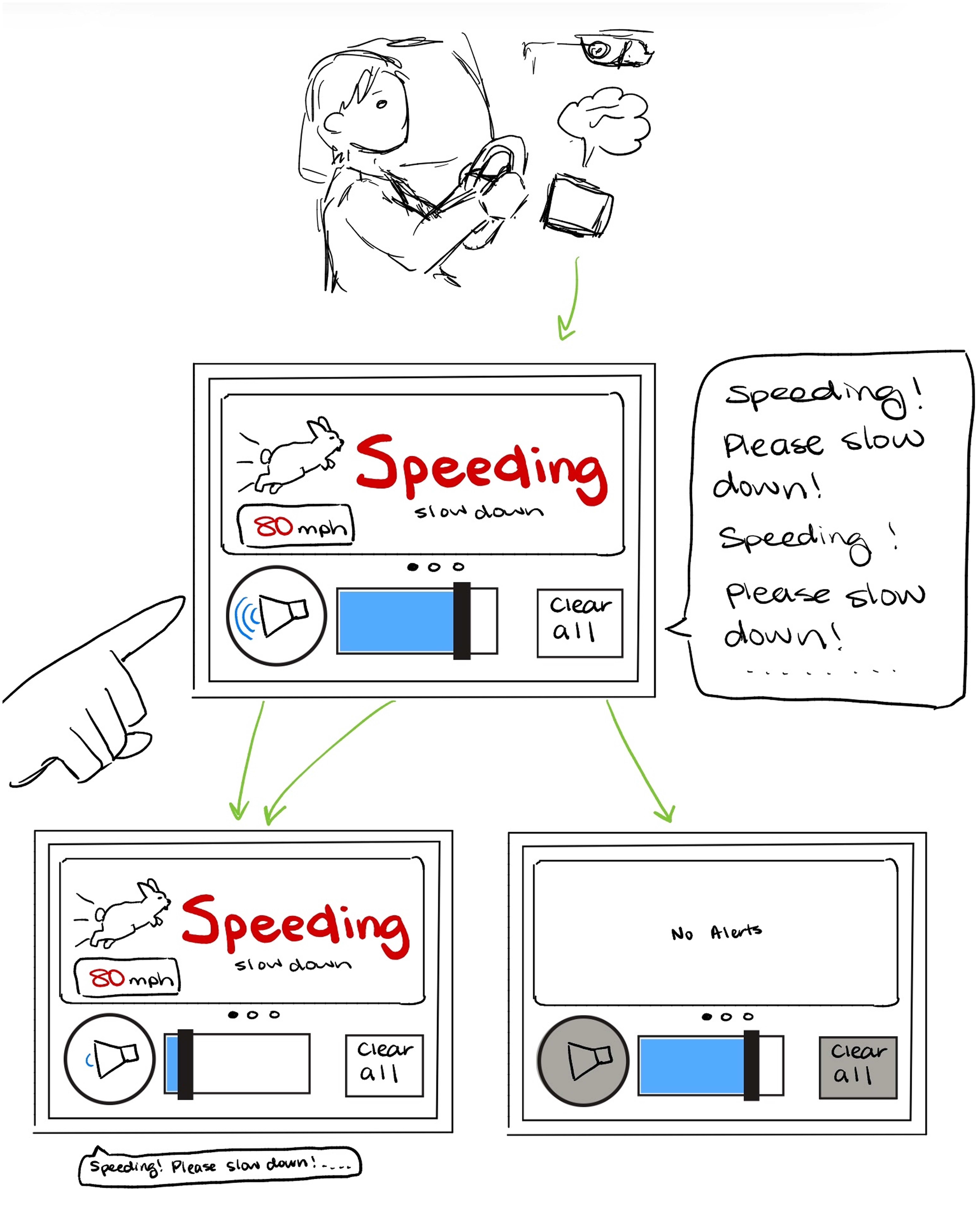 This sketch tries to minimize interactions with any dashboard tablets, keeping their hands on the wheel, by having a button attached to the steering wheel that can resolve alerts. In cases where the alerts are too repetitive, the driver can temporarily mute them, so that they won’t have added distractions, especially when they’re trying to make decisions in stressful situations.