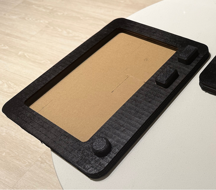We created a frame out of firm cardboard and used a laser cutter to create button spaces at the bottom and a center window for an iPad to slide in. The left button is the volume knob and the right two spring-loaded buttons are the emergency and false report buttons. The iPad displays a Figma prototype. From wireframe to this prototype, most of the features remained similar. The frame with the tablet inserted can then be attached to the dashboard of a vehicle.