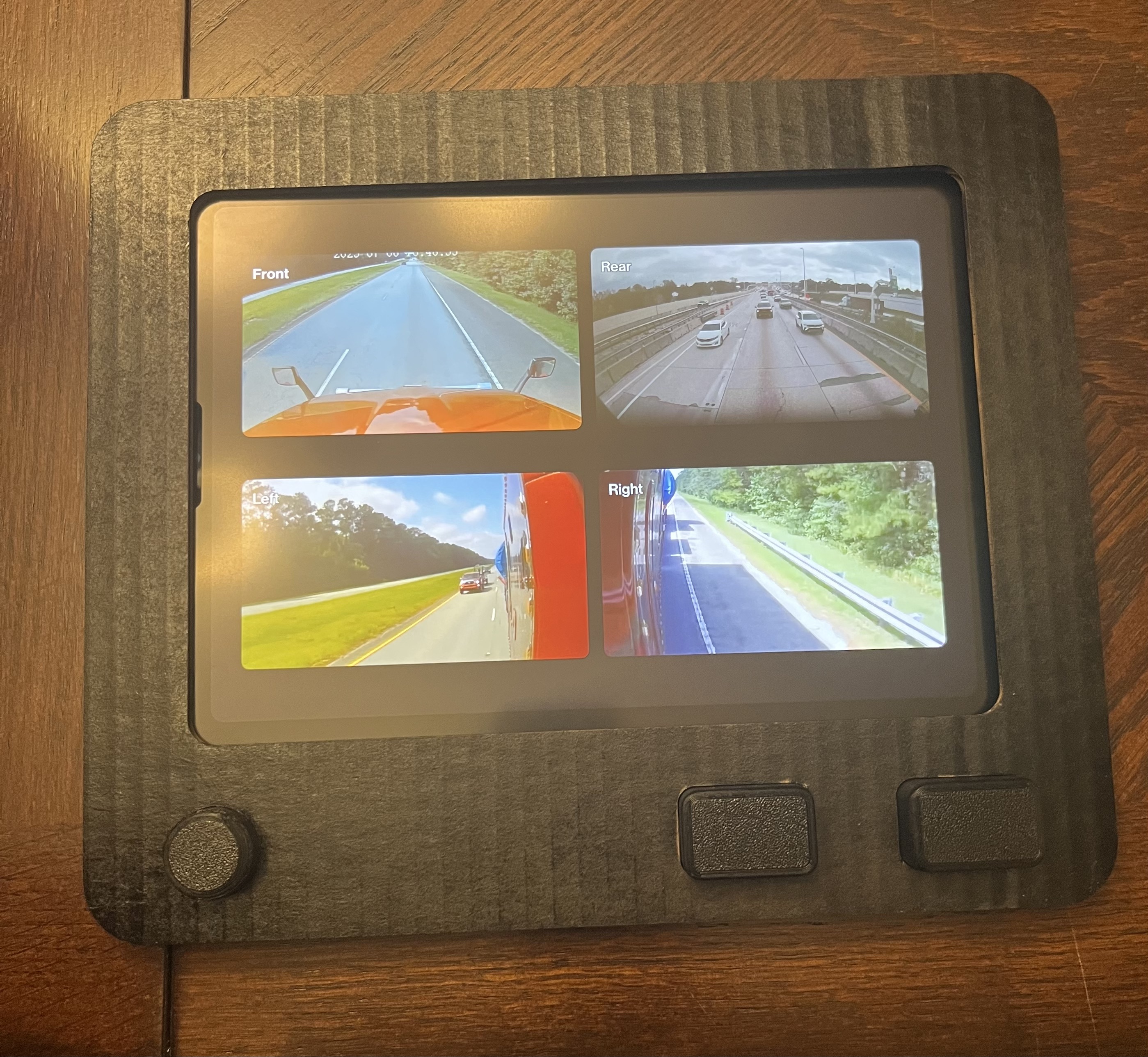 A tablet contains multiple features and is located on the dashboard, where it has buttons placed below the screen (which is not touchscreen like my sketch). The button on the left is a snooze button for muting alerts for 15 seconds, while the right button is a volume control knob for audio alerts. An audio assistance feature allows drivers to report any false alerts. Lastly, when a potential danger appears, like another vehicle is coming too close on the side of their truck, the system will warn the driver with audio alerts and enhanced footage.