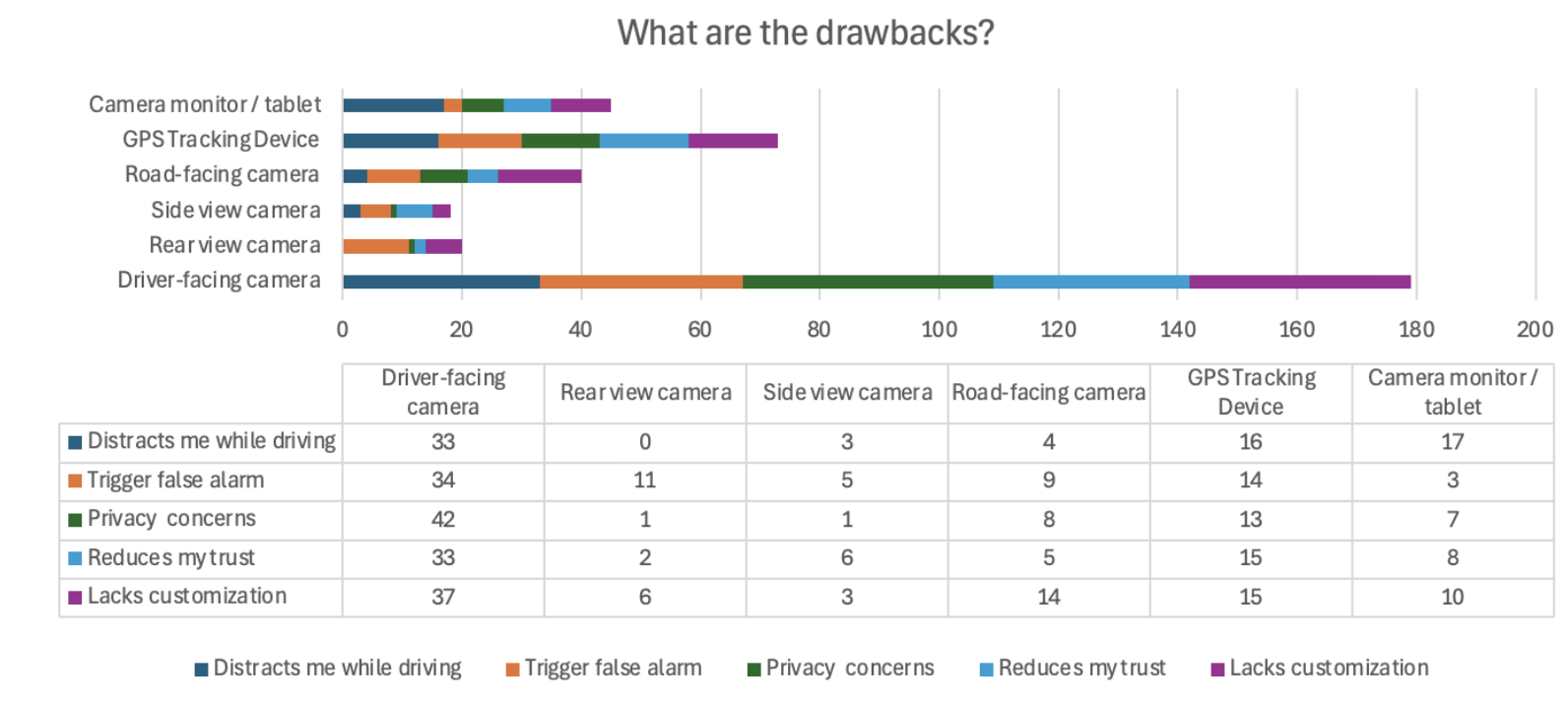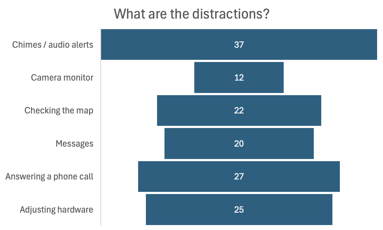 We found that a big point made by many drivers was that the alert system was often more distracting than it was helpful. These alerts come through the systems built-in audio system, but the alerts that chime are described as many times being uninformative, too loud, or too repetitive. In the cases of repetitiveness, drivers felt especially annoyed when they were false alerts, errors from the detection system. They felt that they had no control over the system, even in the events of these technical failures. Most of the drivers we interviewed took their jobs extremely seriously, detailing how they are under strict regulations on their driving habits, so having these added in-cabin issues can lead to further distraction.